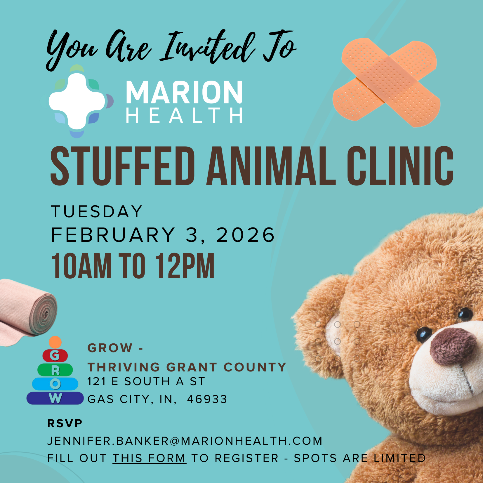 Marion Health, in partnership with GROW: Thriving Grant County, Thriving Mill Township, will be sponsoring our first Stuffed Animal Clinic. This FREE event will take place on Tuesday, February 3rd from 10am-12noon. Spots are limited. Please register your attendance by filling out the following Google form: https://forms.gle/9NNi5niW2yJzgYdDABring your favorite stuffed animal for a check up! Your ...read more